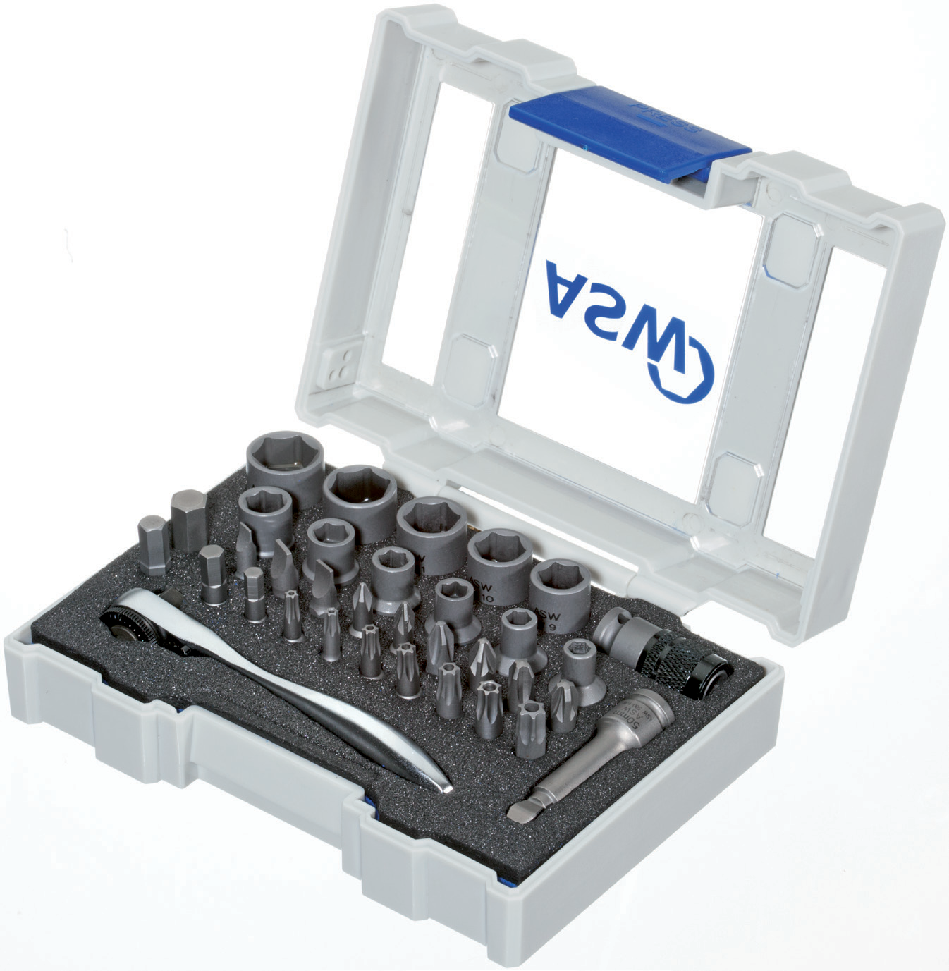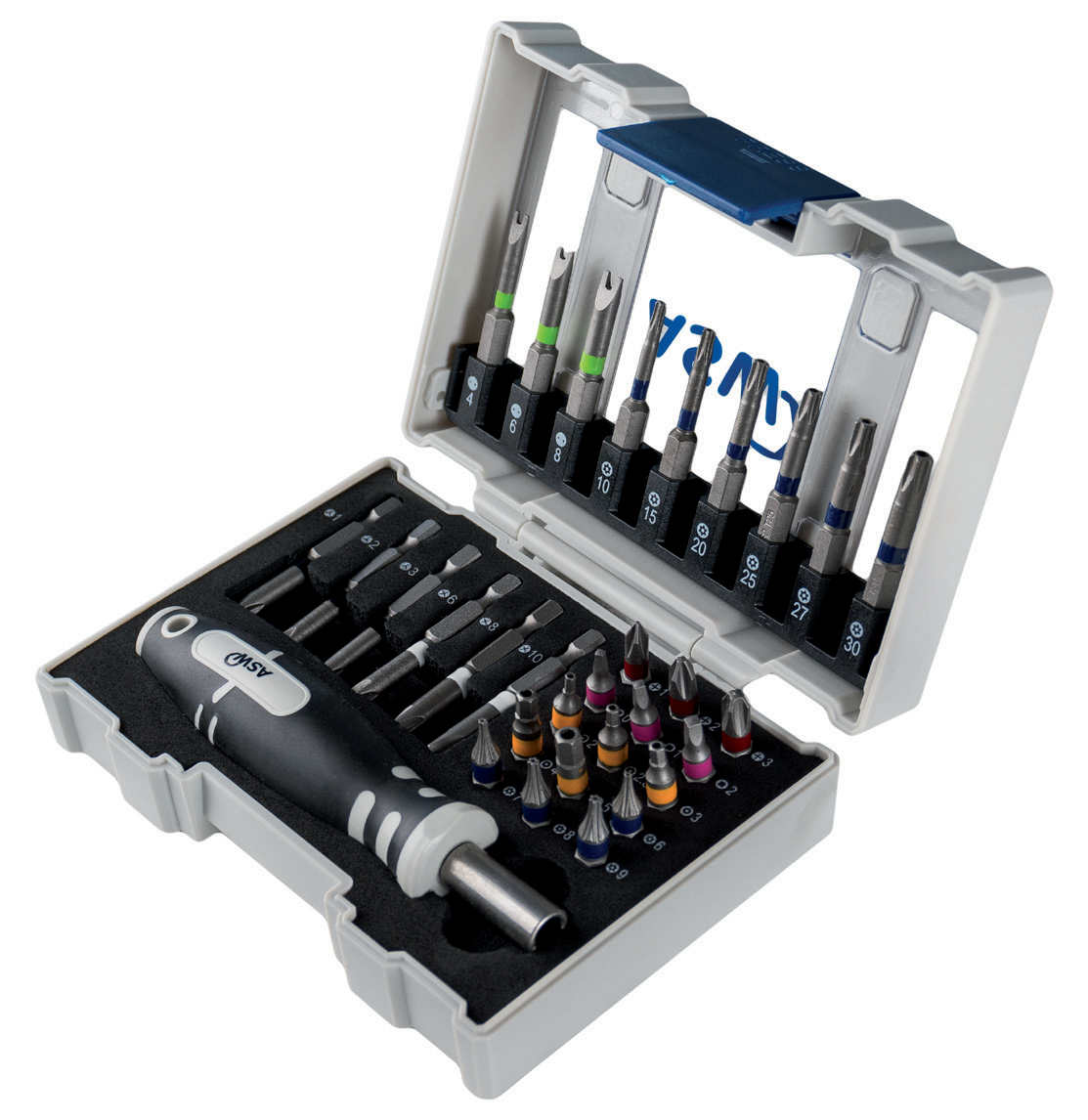 The K‑Line from ASW is the complete box family of stackable boxes with equipment for the different applications. Starting with 31 piece bit boxes for general screwing, we have special equipment for the wood and metal area in the assortment. A special 32 pcs. bit box for safety screwings, a 60 pcs. bit box for heavy duty users as well as a ¼” ratchet version with thin-walled power sockets complete the assortment.