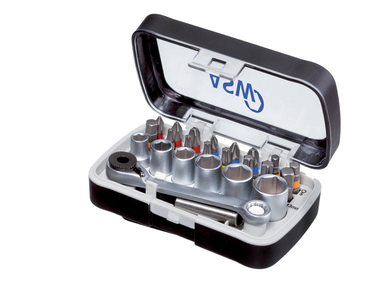 The ASW P‑Line is a family of boxes that is made of ABS and elastomer and appears very robust. In this family we have combined different assemblies for universal, but also special TORX® screw connections in the same design. In addition, you will find a box with CRV sockets as well as a mini ratchet and a larger box for mechanical as well as manual tightening.