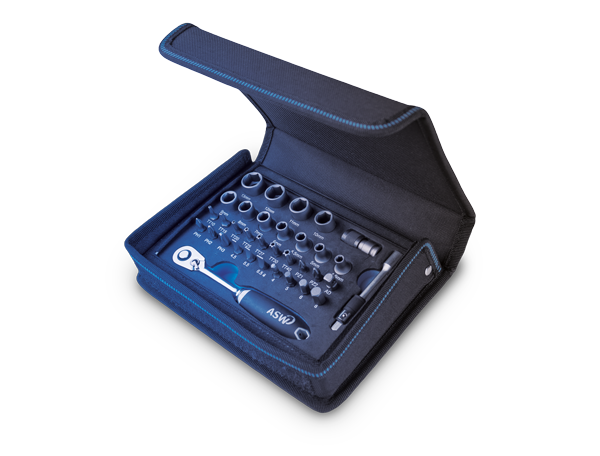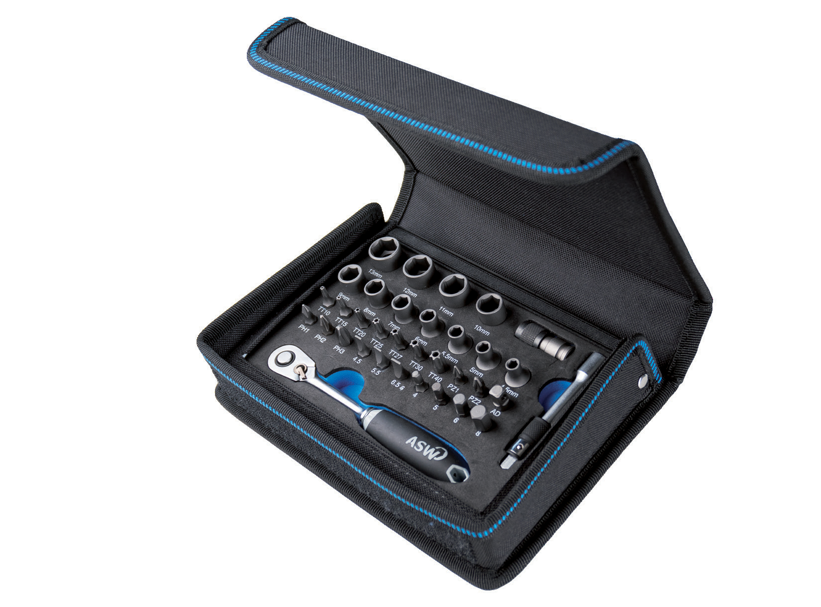 Die neu­en fein­ver­zahn­ten, ergo­no­mi­schen ASW- Rat­schen sowie eine Ver­län­ge­rung sind sowohl für den Ein­satz von Steck­schlüs­seln als auch von Bits geeig­net. Die­se Sets mit Uni­ver­sal­werk­zeug, soll­ten in kei­ner Werk­statt fehlen.
